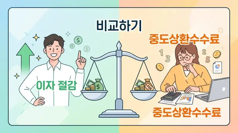 금리가 떨어지거나 내 조건이 개선됐을 때, 대출을 갈아타고 싶은 건 자연스러운 일이에요. 근데 갈아타기의 핵심은 “이자 절감액 vs 중도상환수수료 + 신규대출 부대비용”의 비교예요. 이걸 제대로 안 따져보면 손해 보는 갈아타기를 할 수 있거든요.